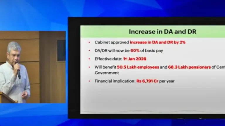 नवी दिल्ली. DA Hike News: केंद्रीय मंत्री अश्विनी वैष्णव यांनी एका पत्रकार परिषदेत माहिती दिली की, केंद्र सरकारी कर्मचाऱ्यांच्या महागाई भत्त्यात वाढ करण्यात आली आहे. ते म्हणाले की, केंद्र सरकारी कर्मचाऱ्यांचा महागाई भत्ता 60% पर्यंत वाढवण्यात आला आहे, म्हणजेच त्यात 2% वाढ झाली आहे. यापूर्वी तो 58% होता. आजच्या घोषणेपूर्वी, त्यात शेवटची वाढ ऑक्टोबर 2025 मध्ये झाली होती.