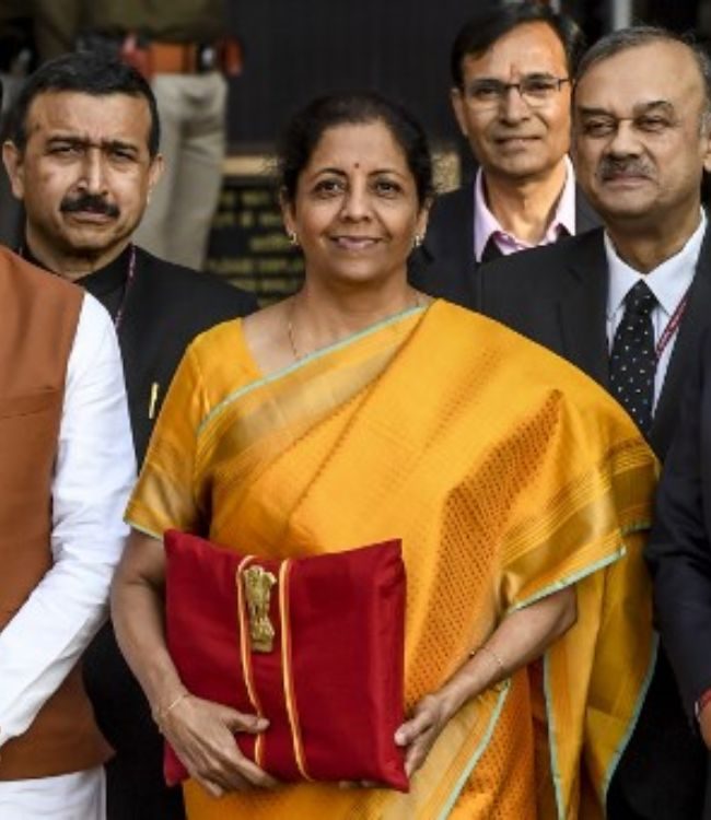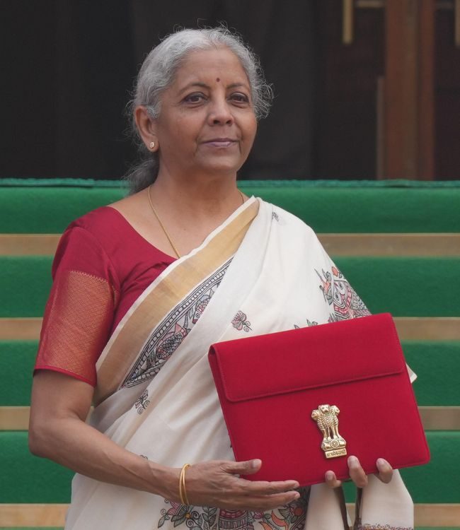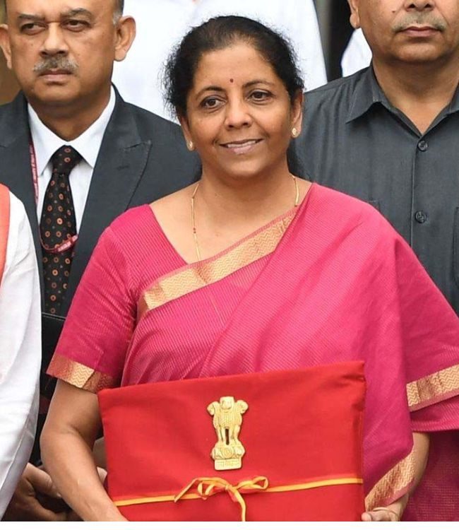 2019 - त्यांनी पहिल्या बजेटमध्ये तिने आंध्र प्रदेशची गुलाबी मंगलागिरी सिल्क साडी घातली. या वर्षी तिने ब्रीफकेसची परंपरा रद्द केली आणि लाल लेजर आणला.