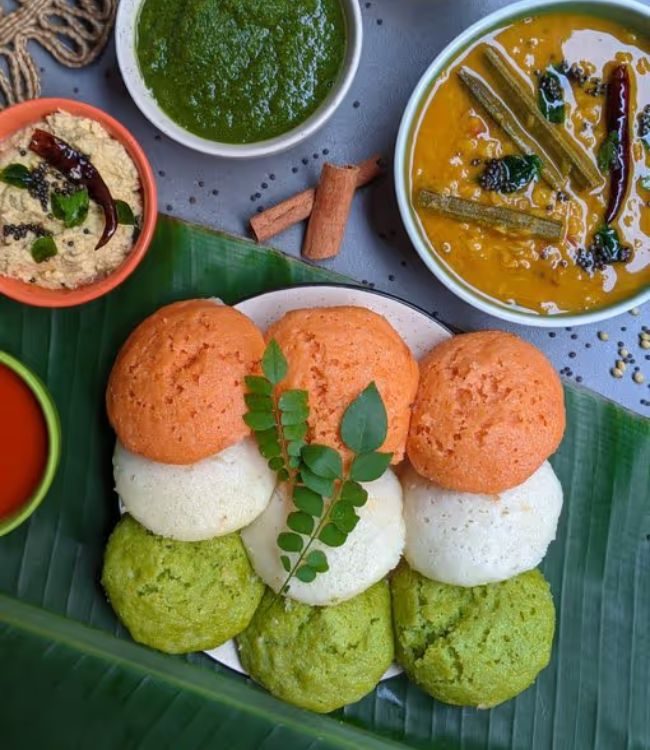 तिरंगी इडली हा नाश्त्याचा एक उत्तम आणि आरोग्यदायी पर्याय आहे. इडलीच्या पिठाचे तीन भाग करा. एका भागात पालक (हिरवा रंग) घाला. दुसरा भाग साधा (पांढरा) सोडा. तिसऱ्या भागात किसलेले गाजर किंवा थोडेसे केशर फूड कलरिंग घाला. इडली स्टँडवर साच्यात शिजवा. ही वाफवलेली डिश पचायला सोपी आहे आणि खूप आकर्षक दिसते.